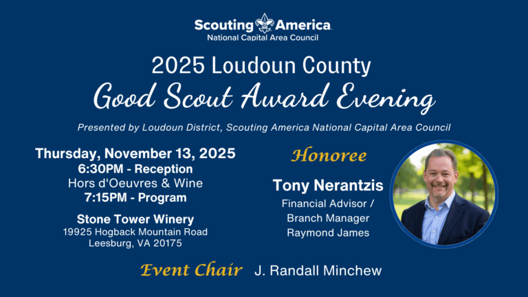 Please join us for the 26th annual Loudoun County Good Scout Award Evening on Thursday, November 13, 2025. This year we will recognize Tony Nerantzis with the 2025 Loudoun County Good Scout Award.
