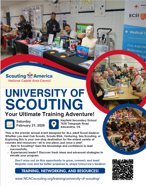 The University of Scouting is a supplemental training opportunity for all adult Scout leaders. It is the only time during the year where you can find the widest variety of training opportunities in all program areas (Cub Scouts, Scouts BSA, Venturing, Sea Scouting) all in one place. Whether you are new to the program or a veteran of many years, the University provides interesting courses applicable across the Scouting programs.